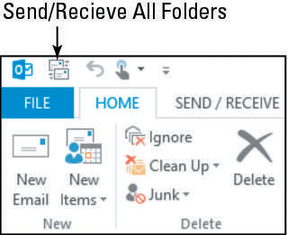 If the Send/Receive All Folders button doesn’t appear on the Quick Access toolbar, click the Send/Receive tab, right-click the Send/Receive All Folders button, and choose Add to Quick Access Toolbar.