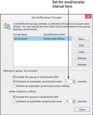 In the dialog box, under the When Outlook Is Offline heading, you find a duplicate of the Schedule an Automatic Send/Receive Entry Every X Minutes option. That setting applies only when you aren’t connected to the Internet. You can have a different interval when offline than when online.
