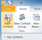 From Contacts view, locate and select the New Contact command on the Ribbon.