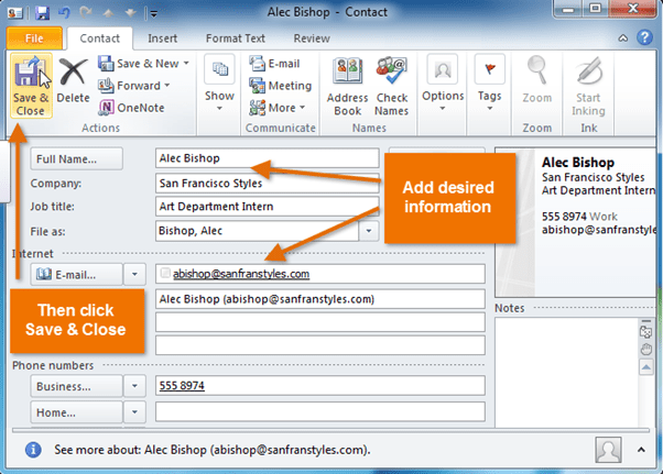 Contacts view is the central place for all your contacts in Outlook 2010. Maintaining a detailed contacts list will make sending emails and scheduling meetings much easier.