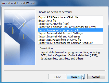 The Import and Export Wizard will appear. Follow the instructions to import contacts into Outlook.