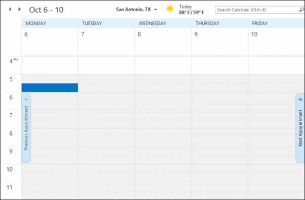 For example, below is the work week view (versus the whole week view). It’s very simple, with the weather (you can set it to your town), and a search box. If you have any meetings or appointments, you’d see them here, and you can skip to the previous or following week by clicking the “Previous Appointment” or “Next Appointment” buttons, respectively, along the calendar edges.