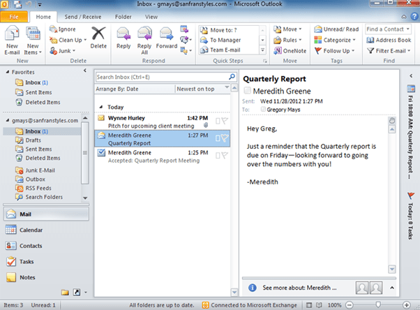 To use Outlook 2010, you’ll navigate between several different views, including Mail, Contacts, Calendar, and Tasks. Because of these robust productivity features, Outlook is often used in many offices and workplaces to help employees communicate, manage their time, and organize meetings.