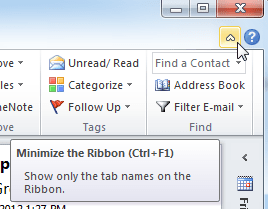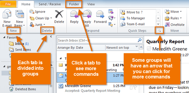 The tabbed Ribbon system was introduced in Outlook 2010 to replace traditional menus. The Ribbon contains multiple tabs, each with several groups of commands. You will use these tabs to complete the most common tasks in Outlook, such as composing an email, scheduling a meeting, or adding a contact. The commands on the Ribbon will change depending on which view you have selected: Mail, Calendar, Contacts, or Tasks.