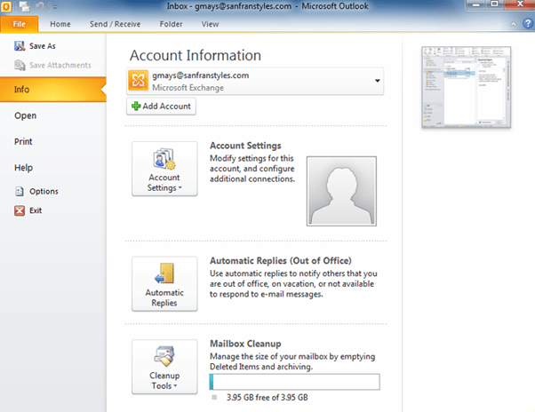 Backstage view gives you various options for managing accounts, saving and printing items (like an email message or calendar), and more. Although it is similar to the File Menu from earlier versions of Outlook, Backstage view will expand to fill the entire screen, unlike a traditional menu. The options in Backstage view will change depending on which view you have selected.