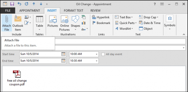 In the following example, we’re getting our oil, and we’ve got a coupon for it. You could print out the coupon and try to remember it beforehand, or you could simply attach it to the appointment so when Outlook reminds you, the coupon is right there so you can print it.