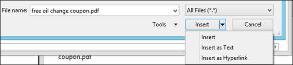 In order to do this, you want to click the “Attach File” and then browse to the location where it is saved. You can either insert the file as is, paste it inline as text, or insert the location of the file as a hyperlink. In this instance, we’re just going to attach the PDF as is.