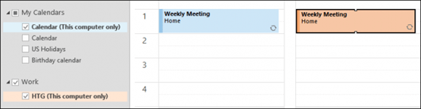 In the following screenshot, you see several calendars have been created, and we’ve also created a special group for work. You can drag events from one calendar to another; you see how we have an entry for a weekly meeting in the two calendar we’ve selected to show.
