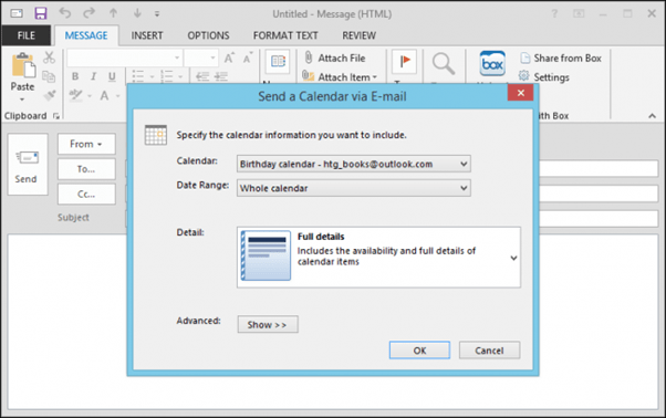 Finally, you can share calendars, of note though is the ability to e-mail a calendar. Here in the following screenshot, you see what happens when you use this option.