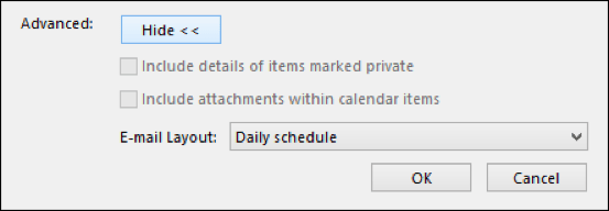 You can specify which calendar you share, the date range (from a single day to the whole calendar), level of details to share (simple availability, limited, and full details), and then there’s a few Advanced options you can use.