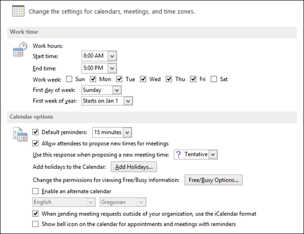There’s quite a few calendar options to sort through. Most of these options are intended to configure the calendar to work more effectively with your professional and personal needs.