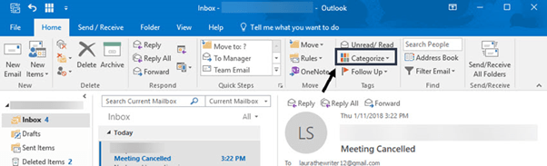 You’ll use the Categorize icon to customize and use categories. The Categorize icon appears in the middle of the Ribbon towards the right side: