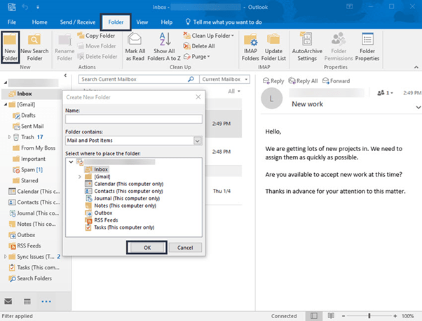 Use the Create New Folder dialog box to add folders and keep your emails organized.