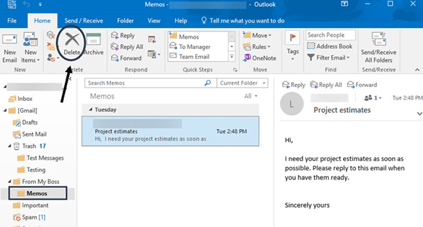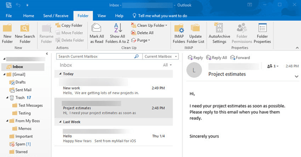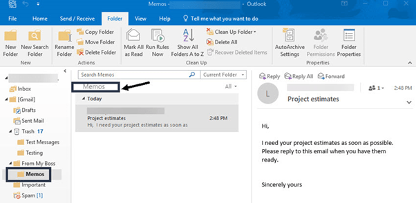 Click on a message to select it and simply drag the message into the folder of your choice. In the example below, I dragged the “Project estimates” email to the Memos folder: