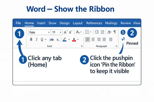In Microsoft Word, click any tab to expand the Ribbon, then click the pushpin icon at the right (Pin the Ribbon) to keep it visible at the top