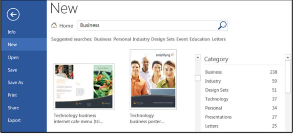 2. Peruse the Suggested Search categories: Business, Personal, Industry, Design Sets, Events, Education, or Letters. For this exercise, select Business.