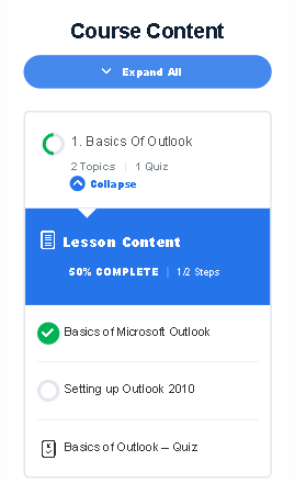 To continue your course from where you left off, simply select the topic that appears directly after the last green tick. In this example, that would be “Setting up Outlook.”
